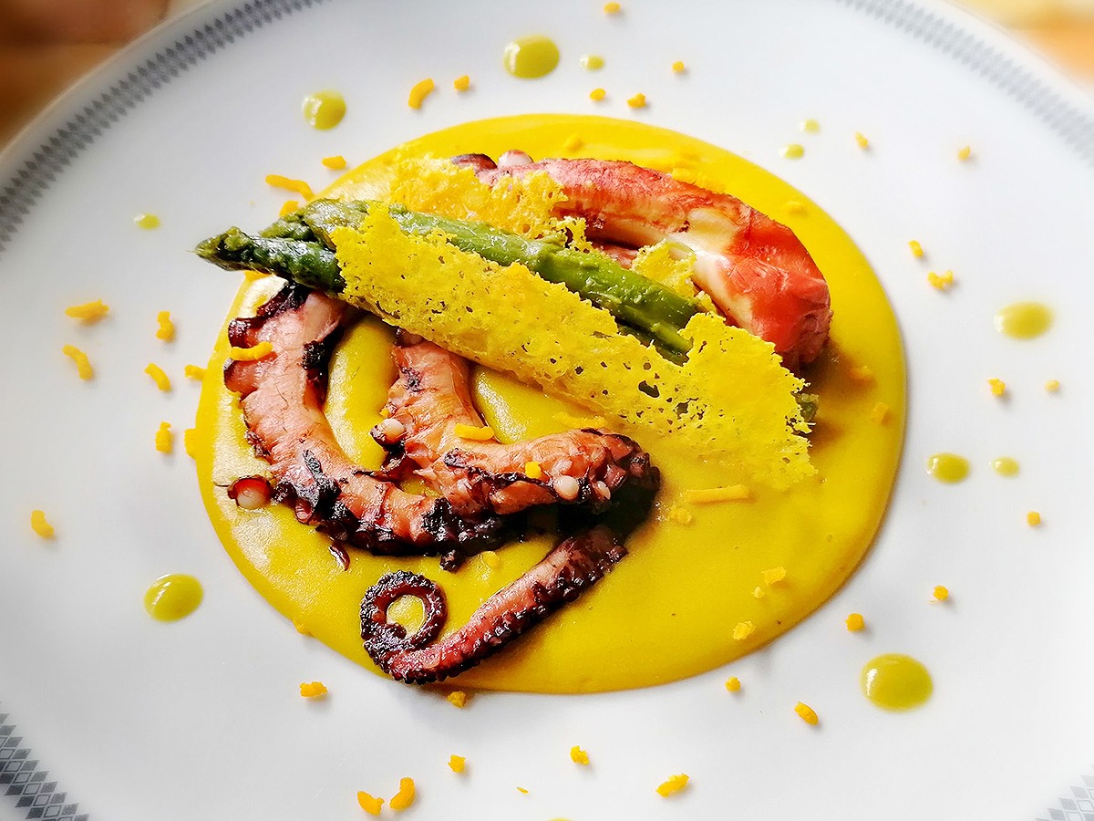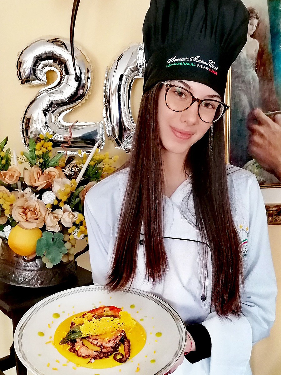 Al primo posto, a parimerito, troviamo Gaia Cesti, giovanissima ed intraprendente studentessa del Corso di Cuoco Professionista, che da sempre spicca per la sua vitalità e per la sua talentuosa capacità di creare piatti ad alto impatto estetico e gustativo, e Giorgio Rosato, un ex allievo diplomatosi con estremo successo e specializzatosi come Chef. Giorgio si è diplomato come Chef Professionista con 100/100 e Premio Accademico Professionale, è un uomo di mondo e di grande cultura, caratterizzato da uno spirito avventuriero che ha magistralmente espresso nel suo piatto. Gaia ci ha offerto del “Polpo in Zona Gialla”, una radiosa metafora che converte il negativo in positivo, con un plating invidiabile di arrosto su crema di asparagi e zafferano, con cialda croccante di grana e uovo mimosa.
