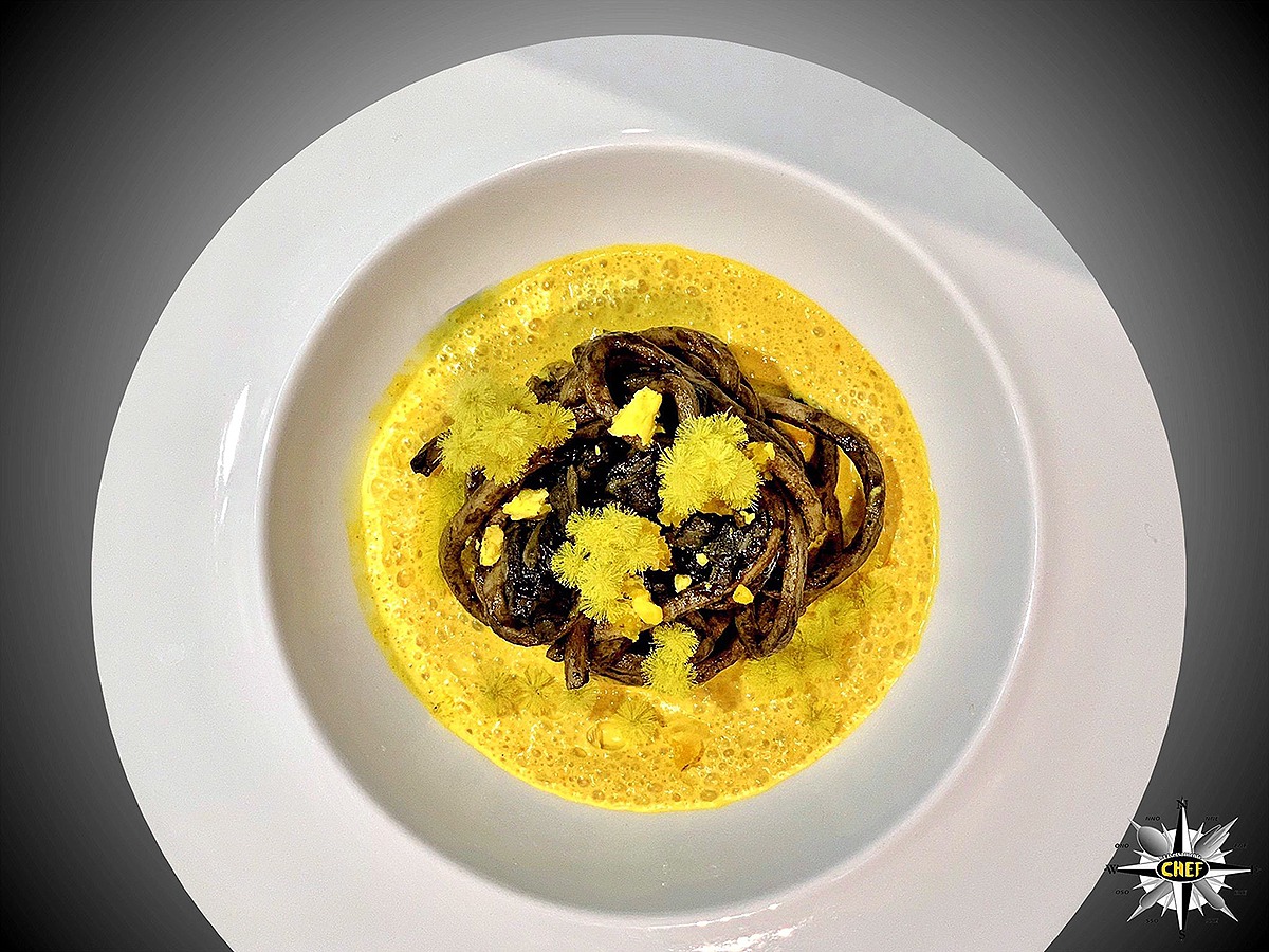 Giorgio invece ci ha presentato dei “Tonnarelli di carruba su bolle di burrata ai fiori di mimosa”. Sono proprio questi ultimi, coltivati in casa in modo naturale e quindi edibili, a fare da frontman ad un piatto che, non a caso, impiega le carrube quale tributo alle lavoratrici nordafricane che ne attuano la coltivazione in condizioni proibitive ed in cambio di miseri guadagni.